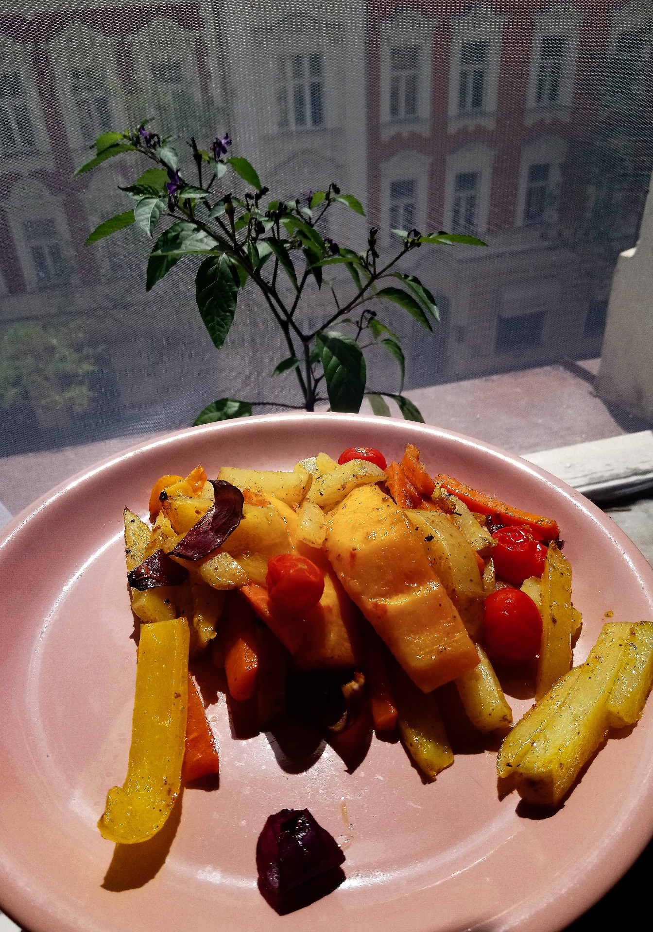 Veškerou zeleninu nakrájíme na rovnoměrné kousíčky (nudličky, kostičky nebo měsíčky). Pokud nemáte rádi rozpečenou dýni, nakrájejte ji dvojnásobně velké kusy. Vše vyložíme na plech potřený olivovým olejem (není třeba šetřit). Osolíme, opepříme a přidáme bylinky - tymián, provensálské koření. Já přidávám adžiku a čubricu. Mají výraznou vůni a úžasně ochutí pečenou zeleninu.